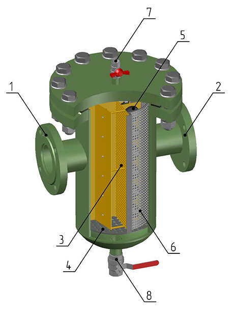 Шламоотделитель магнитный «ТЭМ-ШМ» состоит из цилиндрического корпуса с входным (1) и выходным (2) патрубками. Внутри корпуса размещается съемная система (3) из коррозионностойкого материала с ферритовой магнитной системой (5) и сетка шламовой камеры (4). Выходной патрубок перекрыт изнутри съемным сетчатым фильтром (6). Шламоотделитель магнитный «ТЭМ-ШМ» оборудован воздушником (7) и дренажным патрубком (8), с установленной на них запорной арматурой.
